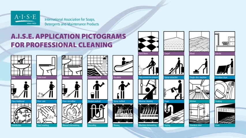 A.I.S.E. has developed pictograms to visually demonstrate what a product is used for and how it is intended to be applied. These are widely used throughout Europe, on labels and in training materials, and are widely appreciated in multi-lingual environments where language can often be a barrier to clear communication.